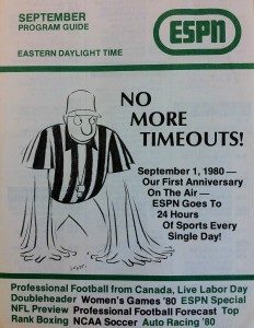 Today I have been asked to write a post about the mood around here on Sept. 1, 1980 — the day ESPN, almost a year into its existence, finally began televising sports 24 hours a day, seven days a week.