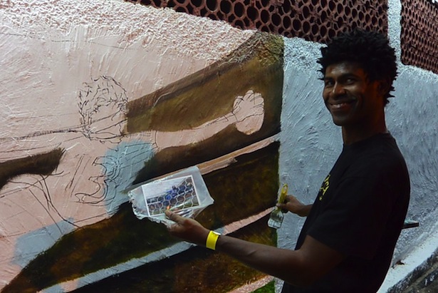 Brazilian artist Jambeiro continues to work on his World Cup mural outside of ESPN’s studios in Rio. (Mike Soltys / ESPN)