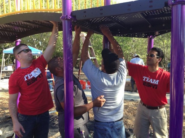 SportsCenter anchor Kevin Negandhi (far right) assists with KaBoom! playground build in San Antonio.