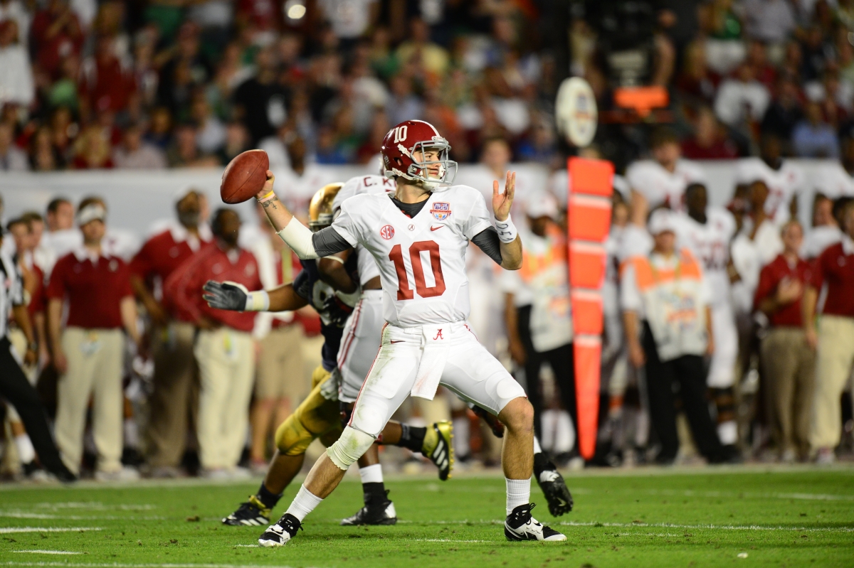 Alabama vs. Notre Dame (Jan. 7, 2013): In a battle of rich college football tradition, Alabama quarterback AJ McCarron led the Crimson Tide to a 42-14 victory over Notre Dame in the 2013 BCS National Championship as an audience of 26,380,000 million viewers watched. The victory resulted in Alabama’s second consecutive national championship and third in four years. (Phil Ellsworth/ESPN Images)