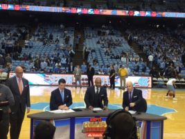 Then, ESPN’s game telecast of Duke’s 84-77 victory transitioned into SportsCenter with anchors Steve Levy and Scott Van Pelt. The show was live on court providing instant reaction and analysis. Duke center Jahlil Okafor also joined the anchors on set.