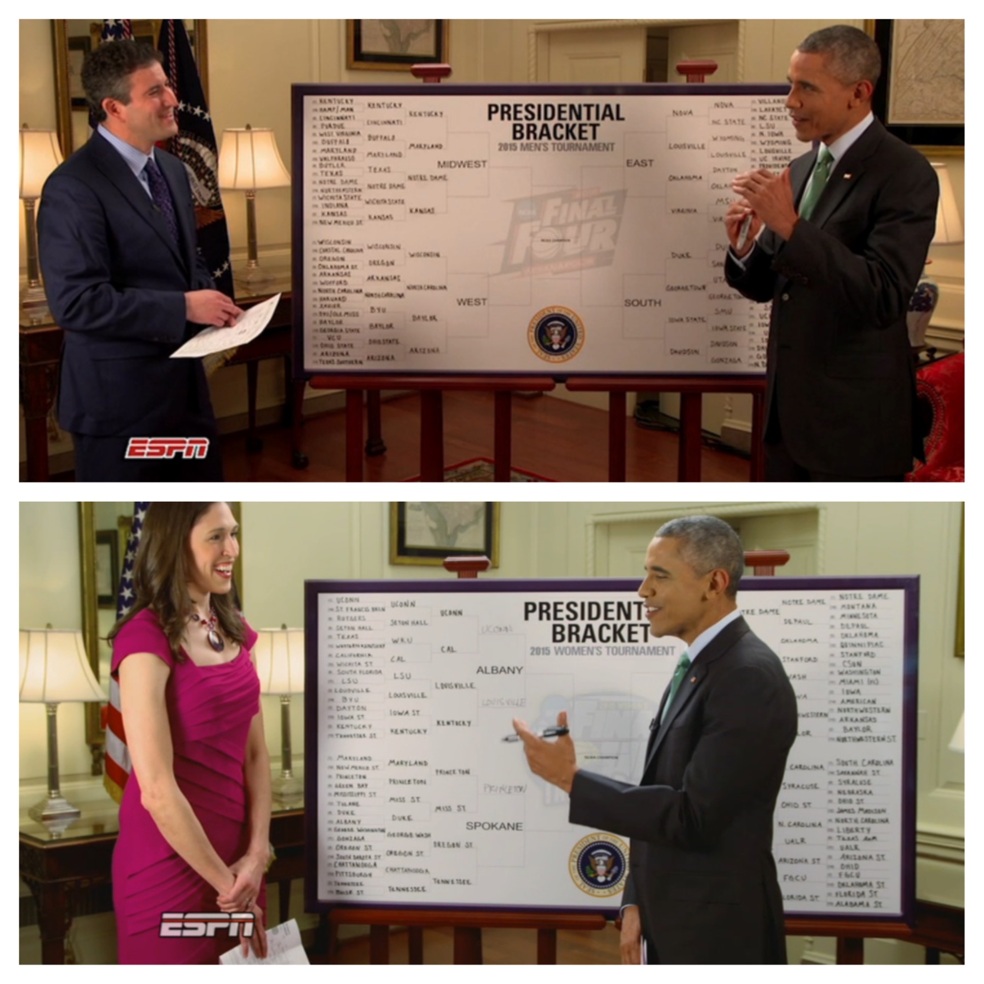 Editor’s Note: In an ESPN exclusive, President Barack Obama filled out his bracket predictions for the 2015 NCAA Division I Men’s Basketball Championship this week with ESPN.com senior writer Andy Katz. SportsCenter unveiled his bracket on Wednesday. This morning, SportsCenter featured ESPN college basketball analyst Rebecca Lobo’s look at the President’s predictions for the 2015 NCAA Division I Women’s Basketball Championship. At the culmination of the Final Four, both bracket boards will be sent to the Smithsonian’s National Museum of American History for an exhibit that will open in 2017. In this Front Row post, Katz provides his thoughts about working with President Obama for the seventh year and the prospect of having the brackets preserved in the Smithsonian. Lobo also reflects on her second year of “Barack-etology.”