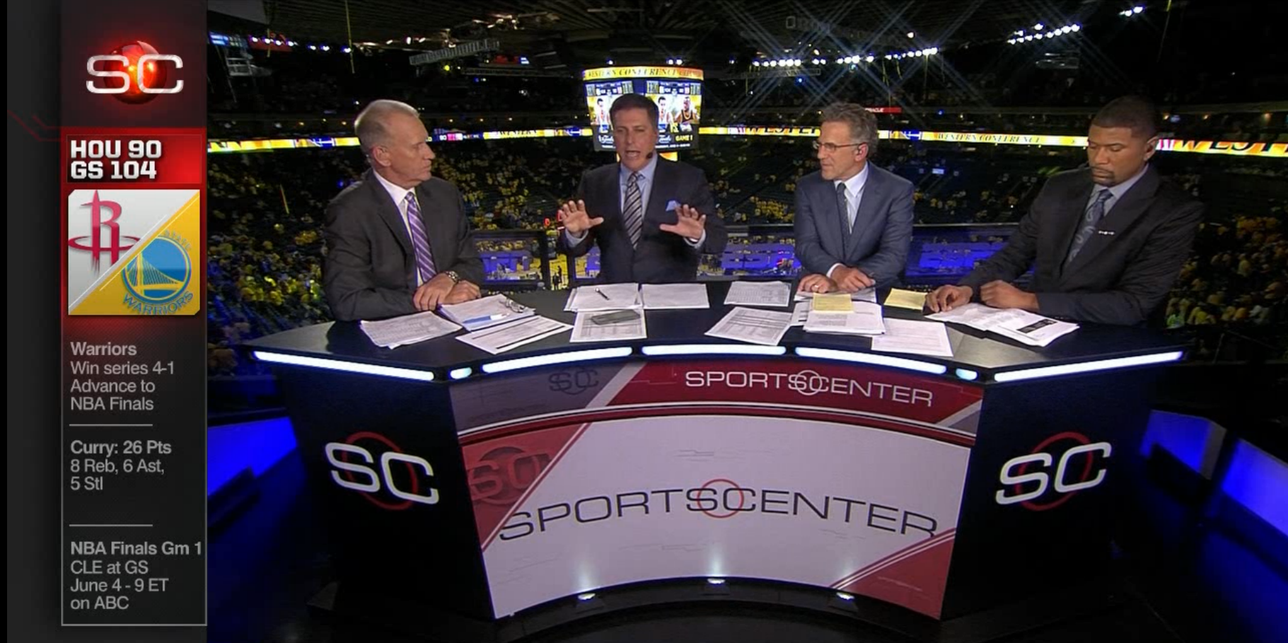 A Rangers’ win tonight would give Levy his first home-ice advantage since he began this coast-to-coast-to-coast marathon. He left for the Bay Area on Monday, May 18 in advance of Game 1 of the Rockets-Warriors series the next night; his duties intensified Thursday, May 21 when he covered both a Dodgers-Giants contest and Game 2 of the Rockets-Warriors series. He returned to Bristol for a Sunday, May 24 stint anchoring SportsCenter before returning to California for the assignments documented above.