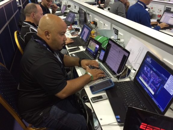 “When I’m doing GolfCast, usually I have my iPad, a TV monitor in front of me, and a Shotlink computer, and then there’s a giant TV screen with the scoreboard,” Collins said. “So I can watch three or four different broadcasts at one time, depending on what I need to see and what people are asking me about, and then follow along with stuff on the computer.”