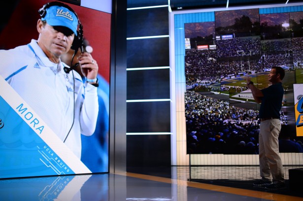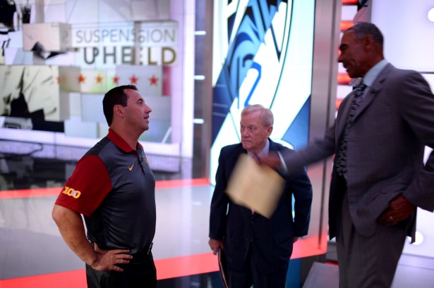 Pac-12 coaches visit ESPN Stanford coach David Shaw (center) chatting with NFL analysts Herm Edwards (l) and Bill Polian on the set of SportsCenter. (Joe Faraoni/ESPN Images) Washington Huskies coach Chris Petersen walking on to the SportsCenter set. (Joe Faraoni/ESPN Images) Oregon coach Mark Helfrich with anchor Hannah Storm on the set of SportsCenter. (Joe Faraoni/ESPN Images) UCLA coach Jim Mora snapping a photo of himself on the SportsCenter set. (Joe Faraoni/ESPN Images) USC coach Steve Sarkisian (l) chatting with Bill Polian and Herm Edwards on the set of SportsCenter. (Joe Faraoni/ESPN Images) Related Articles Local teachers, childcare providers receive COVID-19 vaccinations at ESPN First Take travels to Vegas to preview Mayweather-McGregor; special airs tonight from Vegas Deja vu: Sutcliffe throws out first pitch at Camden Yards Inside look at ESPN’s coverage of the 71st Little League World Series from Williamsport