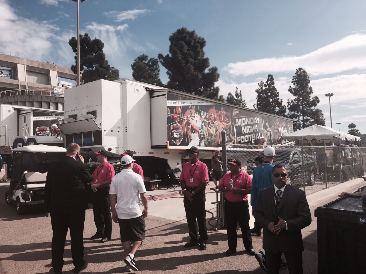 ESPN MNF production trucks are stationed outside Qualcomm Stadium.