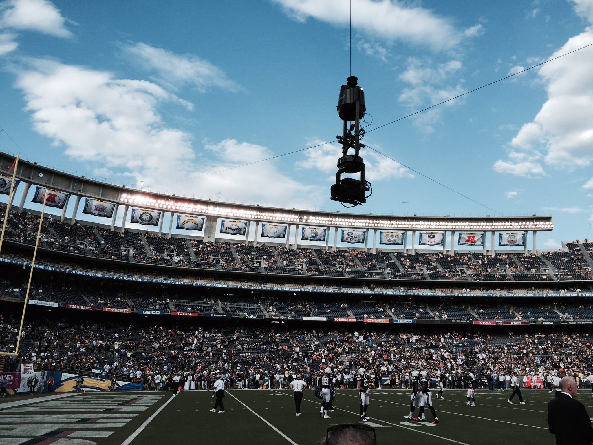The SpiderCam hovers over the Qualcomm Stadium field.