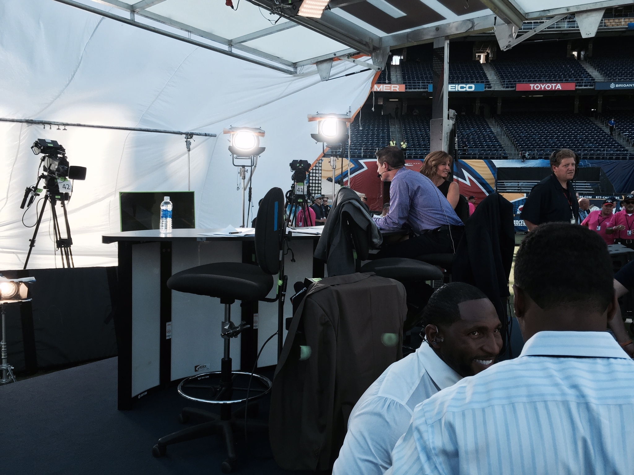 ESPN NFL analyst Steve Young and Monday Night Countdown host Suzy Kolber prep at the desk during a break in the show; analyst Ray Lewis is seen in the foreground.