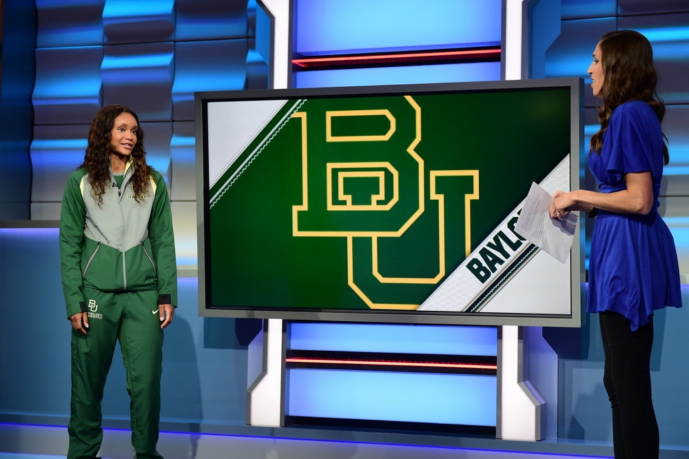 (L to R) Kevin Negandhi interviews UConn head coach Geno Auriemma, Breanna Stewart and Moriah Jefferson on SportsCenter during the NCAA Women’s Basketball Media Day in Bristol, Conn.