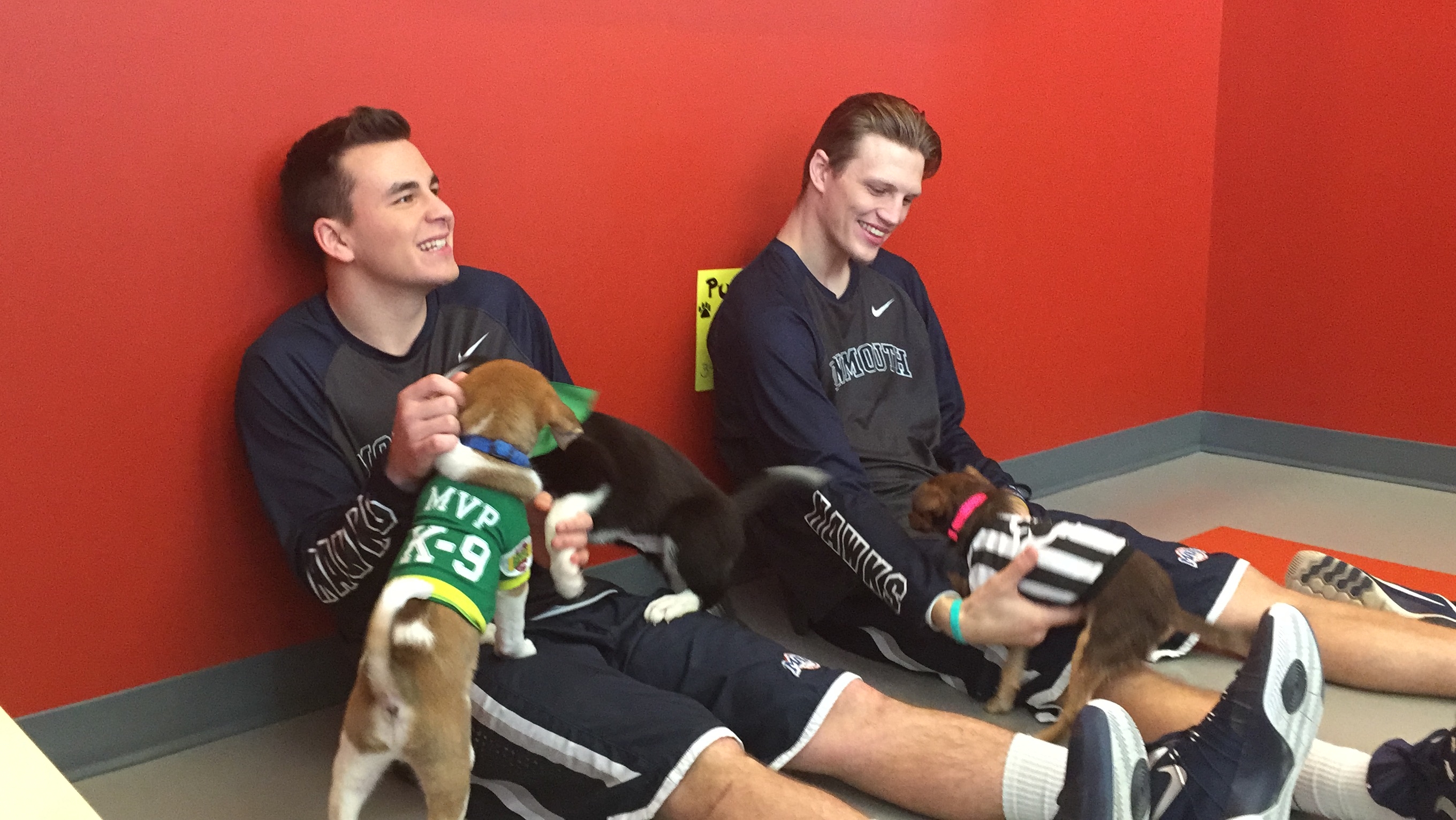 Known for their courtside celebration routines, the Monmouth Men’s Basketball team also visited Bristol on the day of the puppies visit. (Monmouth Bench Twitter)