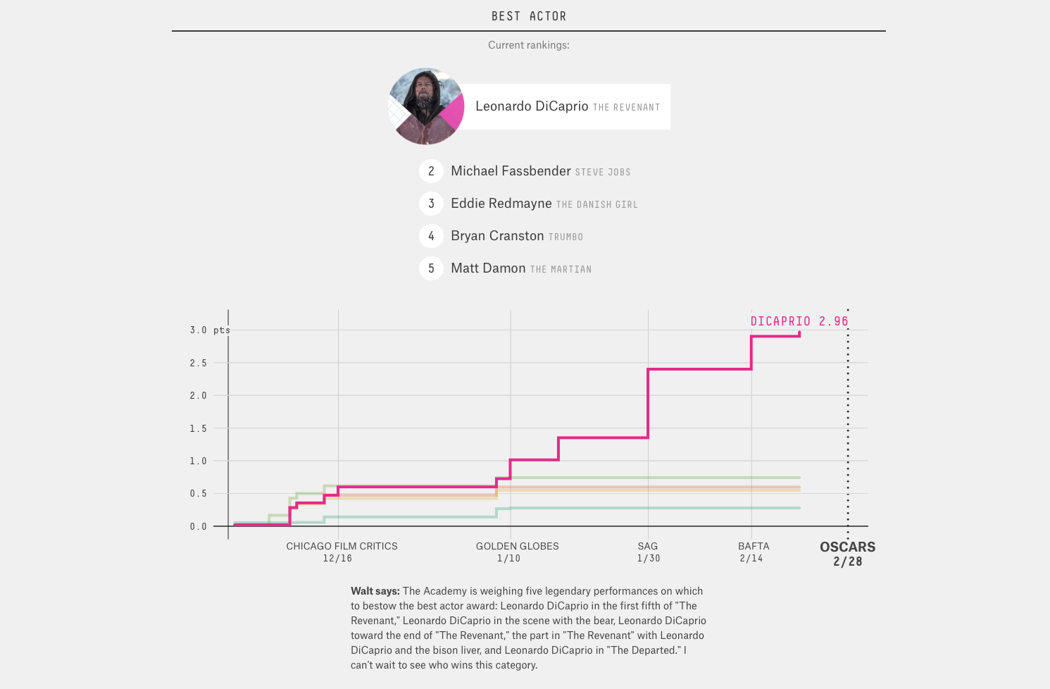 We do that by determining how accurate these events have been [at predicting the Oscar winners] over the past 25 years. In the end, we give a score to each nominee based on what awards they’ve won and on how good these awards are at predicting Oscar winners. [In depth methodology available here]