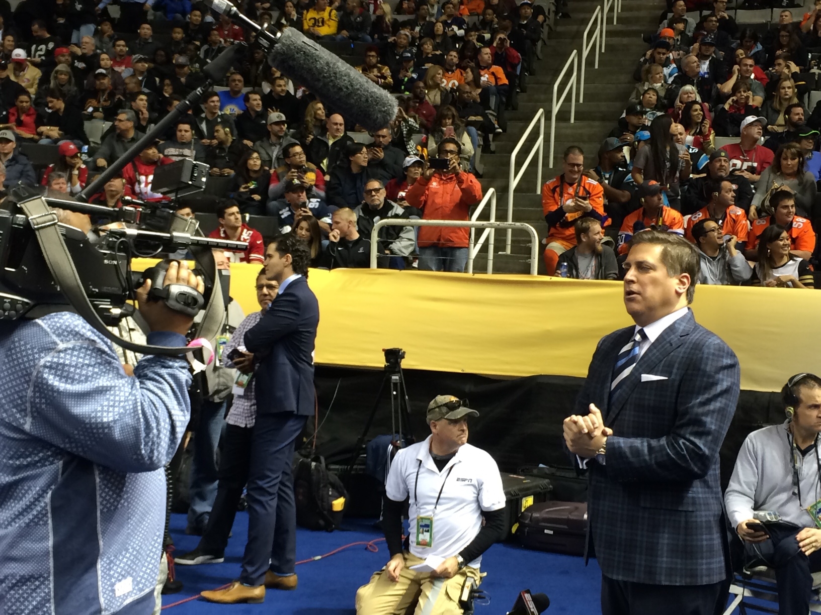 SAN JOSE, Calif. – Monday night, ESPN2 aired SportsCenter Special: Super Bowl Opening Night, a three-hour, live program from the SAP Center featuring interviews with Super Bowl 50 players, coaches and staff from the Denver Broncos and the Carolina Panthers. Front Row captured pictures featuring ESPN’s coverage of the event. Today from from Pier 39 in San Francisco’s Fisherman’s Wharf, Lindsay Czarniak will anchor a one-hour SportsCenter with ESPN NFL analysts Tedy Bruschi and Steve Young. ESPN has extensive coverage of Super Bowl 50.