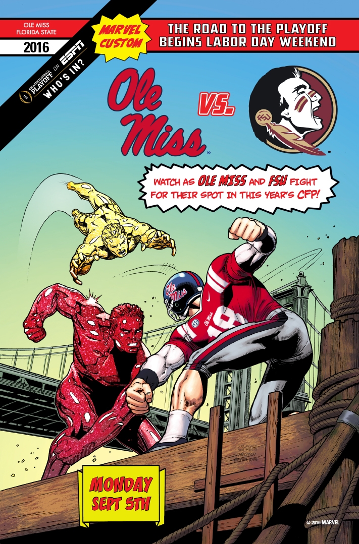 Marvel was approached by ESPN to do something special for College Football’s big opening weekend. Marvel had done some college football promotional covers and even some really cool art for ESPN the Magazine’s “Body Issue.”