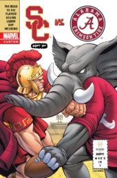 I wanted to honor some of the legends in comics such as Jack Kirby, so I looked through some options of Marvel’s best one-on-one battle covers and selected the six. For Alabama versus USC I decided to use one of my all-time favorite covers, Jack Kirby’s Thor No. 126. Auburn versus Clemson was an unusual one because it was two tigers, so I went with the famous Todd McFarlane layout of Spidey versus Venom.