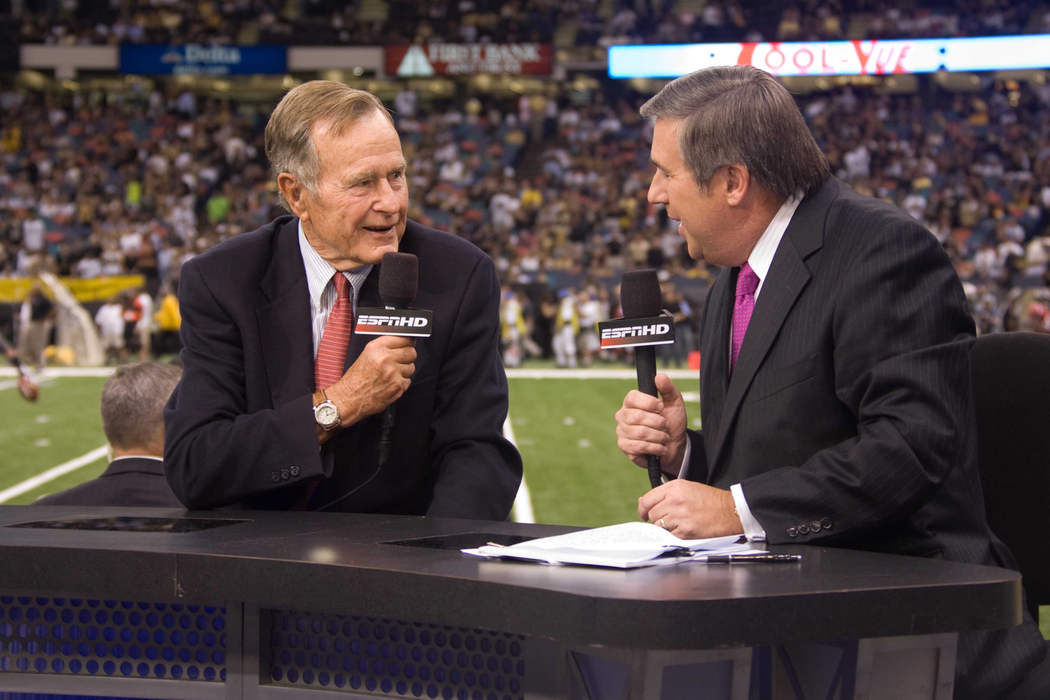 The gallery above highlights ESPN’s coverage from New Orleans that day in 2006. In addition to the game telecast and NFL studio shows on-site, ESPN Radio’s Mike and Mike was live from the dome that morning, and Bob Ley hosted Outside the Lines and segments of Monday Night Countdown, where he was joined by special guests, including former President George H.W. Bush and ABC’s Robin Roberts.