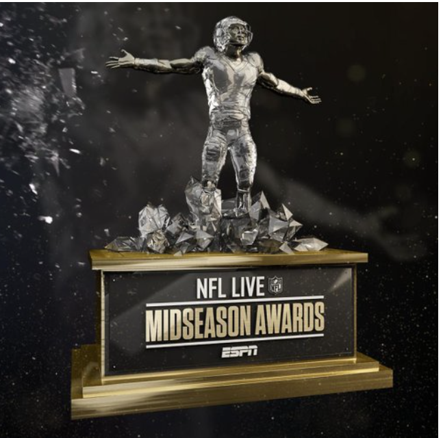 Gold statues – well, they’re not really made of gold – will be awarded to top NFL players and the best coach for their performances in the first half of the season. Fans have the opportunity to vote for the award winners via Twitter in seven categories – Comeback of the Year, Comeback Player of the Year, Coach of the Year, Offensive Player of the Year (Non-QB), Defensive Player of the Year, Offensive Rookie of the Year and Midseason MVP.