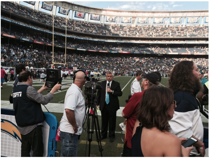 Para mí, el haber crecido en la ciudad de México y haber visto muchos partidos de la NFL con mi papá, ese fue un día muy especial. Creo que algo muy divertido ese día fue que coincidió con que México jugaba la final de la Copa Mundial de la FIFA Sub17. Y cuando los jugadores de los Cardinals y de los 49ers salieron a calentarse, hubo gritos de entusiasmo y apoyo, pero no era por ellos; era porque México estaba ganando la Copa Mundial.