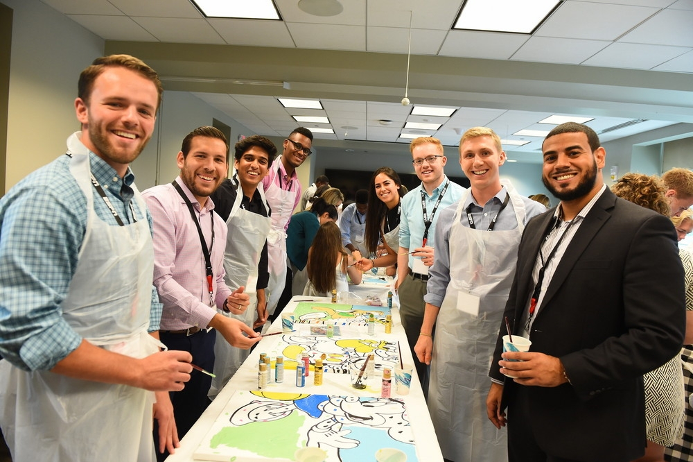 After lunch and networking, the interns worked together to paint six Disney-character-themed canvases, creating one large mural for a children’s hospital.