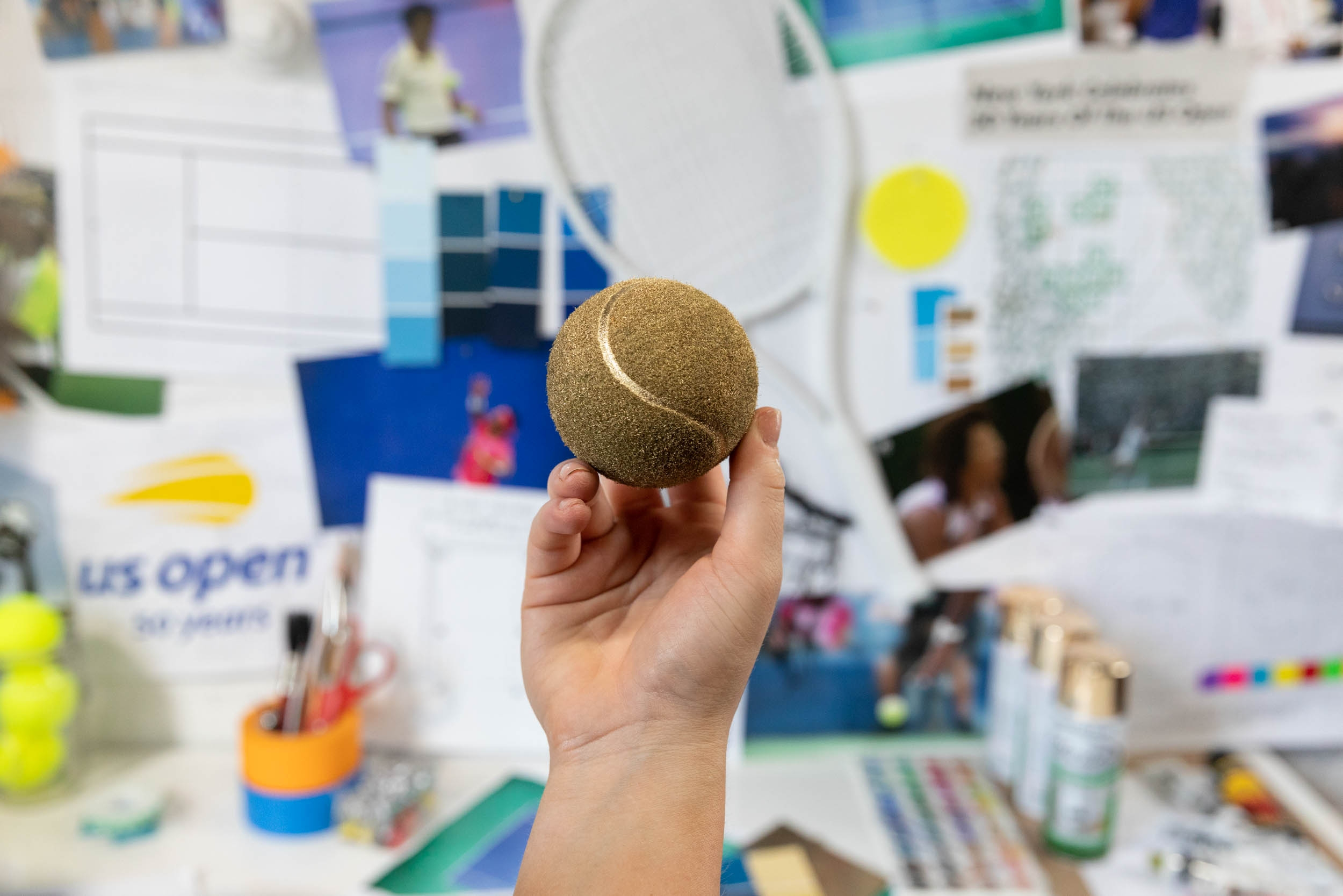 Understanding we only had one day to execute the portraits, I knew the planning had to be done with intense precision. I spent about a month designing, measuring, and calculating the pieces. During the week leading up to the shoot, a team of wonderful painters and myself hand painted 5000 balls, picking up each ball one by one. We also painted 232 rackets, seven nets, and other tennis materials with antique gold-colored paint to commemorate the 50th anniversary of the US Open.