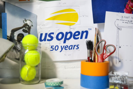Understanding we only had one day to execute the portraits, I knew the planning had to be done with intense precision. I spent about a month designing, measuring, and calculating the pieces. During the week leading up to the shoot, a team of wonderful painters and myself hand painted 5000 balls, picking up each ball one by one. We also painted 232 rackets, seven nets, and other tennis materials with antique gold-colored paint to commemorate the 50th anniversary of the US Open.