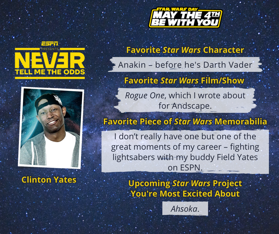 Yates: “As a kid who grew up obsessing over the galaxy of Star Wars, to be able to get together with buddies and talk about what is one of the most creative worlds we have from the standpoint of sports is truly a dream come true. The force is strong, it turns out.”