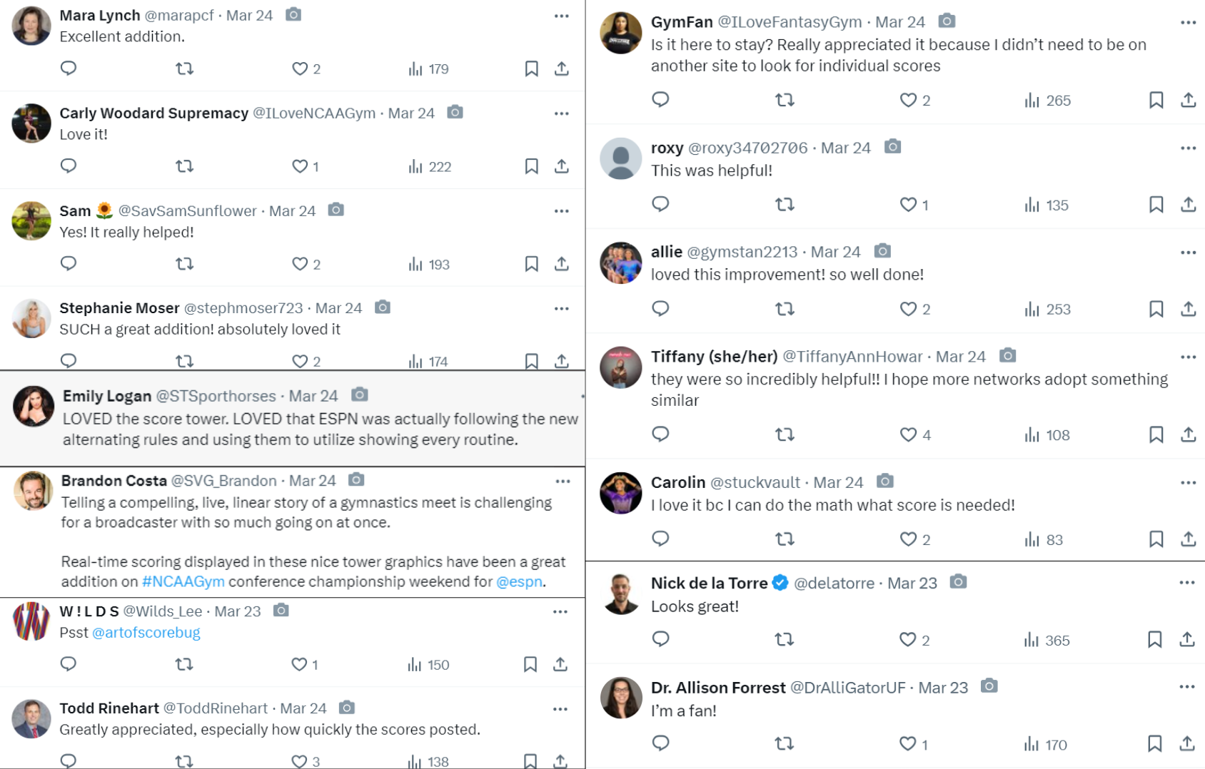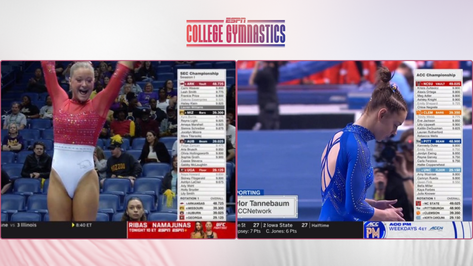The score tower will be used in quad meets moving forward on ESPN’s linear platforms, including this weekend’s NCAA Championship on ABC, ESPN2, and ESPN+. This furthers ESPN’s strategy to innovate and inform viewers as the company’s commitment to women’s sports storytelling continues.