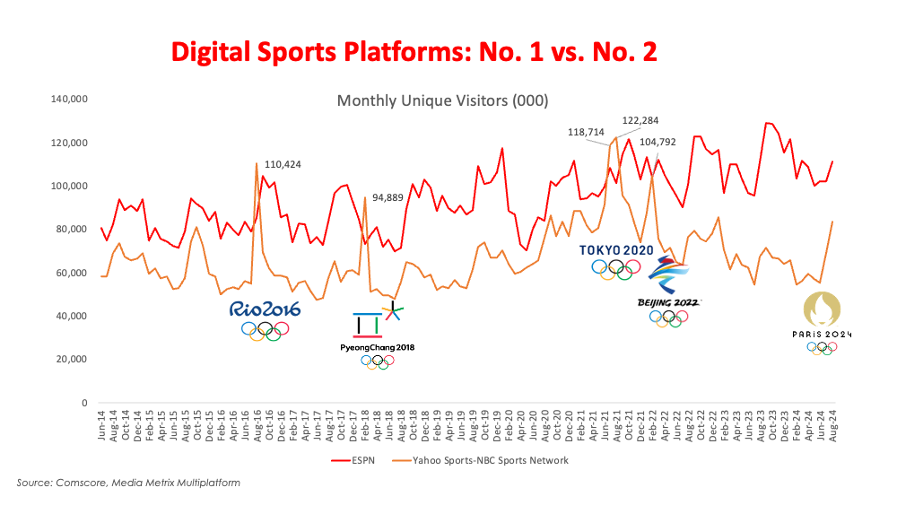 The achievement is notable because, over the course of the last decade, the only months where ESPN’s competition would have a larger digital audience were the Yahoo-NBC-led Summer or Winter Olympics instances. This July and August marked the first time ESPN Digital “won” the Olympic months. Two and a half years straight of having the most-visited digital platforms in sports media is impressive in and of itself, too!