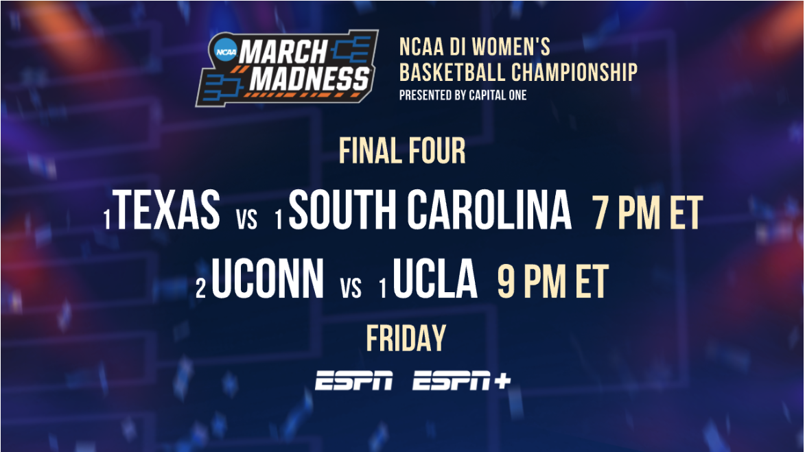 More than 350 ESPN employees are on-site here, as the action tips off Friday, April 4, at 6 p.m. ET with the NCAA Women’s Final Four Special Presented by Capital One on ESPN. The first semifinal between No. 1 Texas and No. 1 South Carolina is set for 7 p.m., followed by No. 2 UConn and No. 1 UCLA at 9 p.m. Both semifinals will receive the MegaCast treatment with offerings on ESPN, ESPN2 and ESPN+.