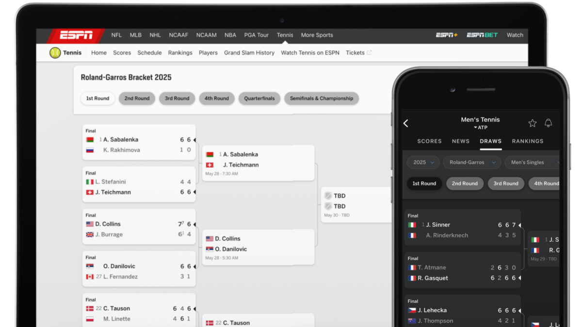 What’s new: ESPN has introduced an upgraded, responsive tennis bracket experience, available on ESPN.com and, for the first time, in the ESPN App in time for the French Open. The completely redesigned tennis bracket includes deeper historical data, more intuitive navigation and a faster, more engaging user experience for all tennis majors going forward, including the Australian Open, French Open, Wimbledon and US Open.