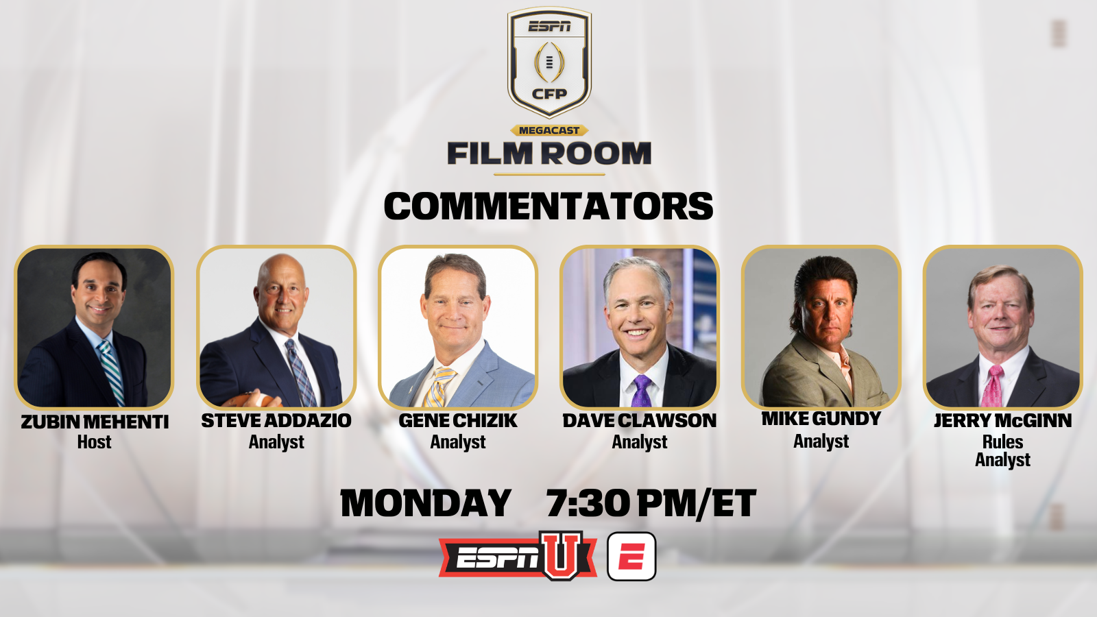 After a four-year hiatus, fan favorite Coaches Film Room returns to the MegaCast. Set for ESPNU on Monday night, Zubin Mehenti hosts alongside former head coaches Steve Addazio, Dave Clawson, Gene Chizik and Mike Gundy, as well as rules analyst Jerry McGinn. The crew will be live from Bristol to provide unique insight and analysis surrounding Monday night’s matchup.