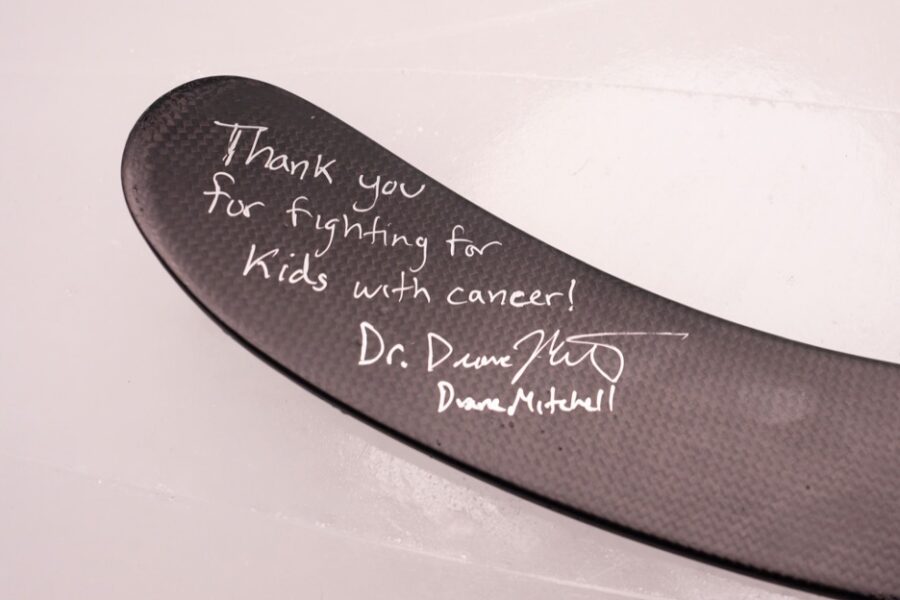 Nolen and the team knew that fully representing Alex’s off-ice commitment to the community needed to include his work helping kids with cancer. His efforts have raised over a quarter of a million dollars for pediatric cancer research with the V Foundation. Dr. Duane Mitchell, who presented Alex with a signed stick, is a physician scientist that leads a team at the University of Florida focused on pediatric cancer research. “It was extremely powerful to have Dr. Mitchell say, ‘thank you,’” Nolen noted.